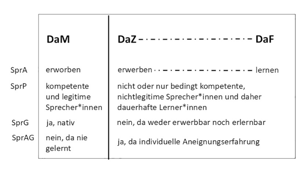 Tabelle mit zwei Spalten: DaM links, DaZ und DaF rechts. Darunter vier Zeilen mit SprA, SprP, SprG und SprAG, die in den Spalten erläutert werden.