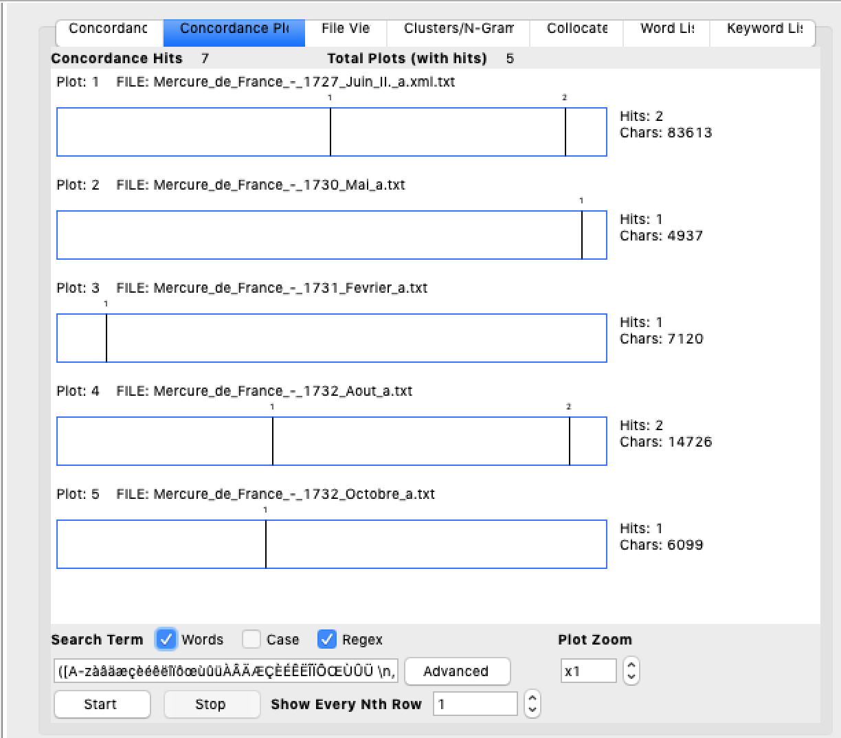 Voyant Tools is a web platform containing several open access text analysis tools.[25] It was developed by Geoffrey Rockwell and Stéfan Sinclair and is freely accessible on the web. The tools available operate mainly on word frequencies as well as the calculations of word distances. They span from well-known applications such as word cloud visualizations (Cirrus) to more elaborate tools focusing on the calculation of word repetitions throughout a text (Knots).[26] For the purposes of the projects in this volume the scope of tools provided by Rockwell and Sinclair is enough. In practice, it seems to be especially appealing to literary scholars and their interests in the use, frequency, and distribution of words and phrases throughout a text. Malte Lorenzen makes use of Voyant Tools in his article “Testing Hypotheses with Dirty OCR and Web-Based Tools in Periodical Studies”.[27] One of the tools he uses is Cirrus, the world cloud tool. Although the developers claim that word clouds “are limited in their interactivity […] [and] do not allow exploration and experimentation”,[28] Lorenzen uses a series of these clouds to achieve just that. Confronting the different clouds with each other renders them exploratory after all through the practice of comparing. At the center of this comparison lies data that can be viewed as a representation of text, or rather as information about text. Rockwell and Sinclair claim that, in general, “[v]isualizations are transformations of text that tend to reduce the amount of information presented, but in service of drawing attention to some significant aspect.”[29] In the case of the word cloud the ‘significant aspect’ is the frequency of words in relation to each other represented by the relative size of their visualization. Hence, using digital text analysis tools often does not give us concrete or direct information about texts as a whole but about words, or character combinations, that need to be related to textual documents as superordinated, larger units before they can be interpreted. As Rockwell and Sinclair put it, “the magic of digital texts is that they are composed of discrete units of information – such as the character unit – that can be infinitely reorganized and rearranged on algorithmic whims”. [30] Whether it is magical or not, analyzing small, linguistic units of information instead of reading texts as indivisible entities offers new insights for researchers working on textual material as is being proven by the contributions in this volume. Joris C. Heyder and Christine Peters made use of a tool called AntConc for the same purpose.[31] Developed by Laurence Anthony,[32] AntConc “is a freeware, multiplatform tool for carrying out corpus linguistics research and data-driven learning”.[33] Other than Voyant Tools, it is a stand-alone tool that can be downloaded and installed locally on a computer. The tool comprises a Concordance Tool, a Concordance Plot Tool, which offers a barcode visualization of a keyword in context results, a File View Tool, N-Grams and Collocates Tools as well as Word List and Keyword List Tools. This range of tools is especially useful for studies interested in the word use present in certain documents or corpora. It offers the possibility to look for words surrounding specific keywords that offer insight into the concepts represented by words.